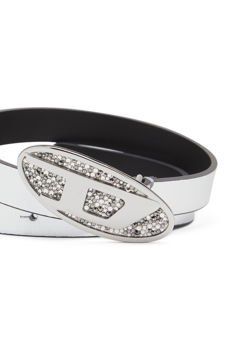Cette Ceinture Pour Femme Est Taillée Dans Du Cuir Argenté. Il Arbore Une Boucle Logo D Ovale, Incrustée De Cristaux De Différentes Tonalités Et Tailles.