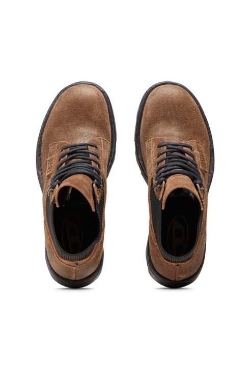 Bottes à Lacets Pour Hommes Conçues Avec Des Cols Extensibles Et Des Semelles Crantées Très épaisses. Confectionnée En Cuir De Veau De Première Qualité Dans Une Teinte Marron, Cette Chaussure Présente Un Traitement Craquelé, Des Lacets Cirés Et Des Crochets à œillets Inspirés De La Randonnée.