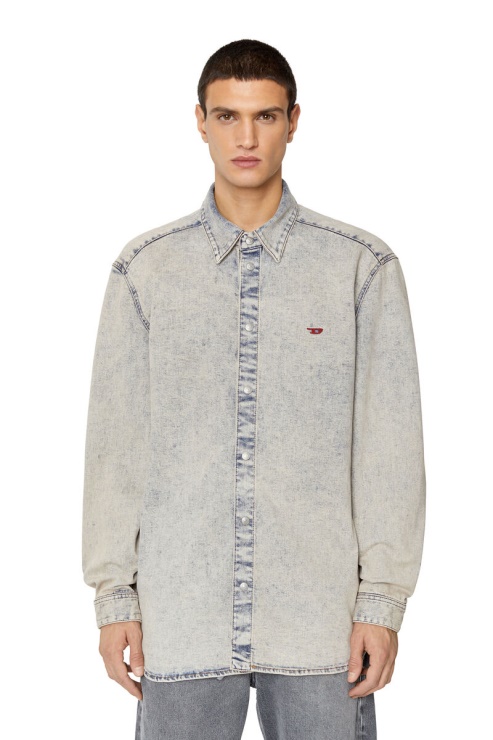 Faisant Partie Du Défilé Automne/Hiver 2022, Cette Chemise En Jean Pour Homme A Une Coupe Classique Et Une Fermeture à Boutons-pression. Ce Diesel Rehab Denim Est Un Tissu Innovant Mettant En Avant Une Approche Plus Circulaire. Le Jean Est Confectionné À Partir De Coton Et D'élasthanne Entièrement Recyclés Fabriqués À Partir De Tissus Existants, Et Présente Un Délavage Bleu Clair Avec Un Effet Ombré Audacieux.