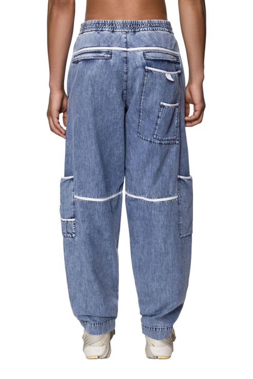 Style Ample Avec Une Taille Régulière Et Une Jambe Droite. Le Design Multi-poches En Tissu Léger S'inspire Des Jeans De Vêtements De Travail D'archives Et Donne Une Touche Contemporaine Avec Des Détails De Reliure Blanche. Présentant Un Look Graphique En Trois Dimensions, Ce Délavé Bleu Clair Est Confectionné Dans Un Tissu Légèrement Extensible Et Orné D'un Liseré Blanc Contrastant Le Long Des Multiples Poches Et Coutures.