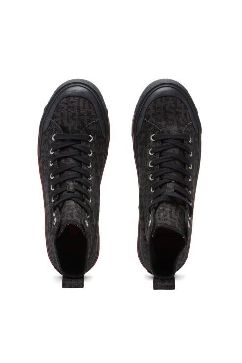 Baskets En Denim Noir Pour Homme Avec Une Silhouette Montante. Ces Chaussures à Lacets Sont Ornées D'un Monogramme Diesel Intégral Et Reposent Sur Des Semelles En Caoutchouc Vulcanisé.