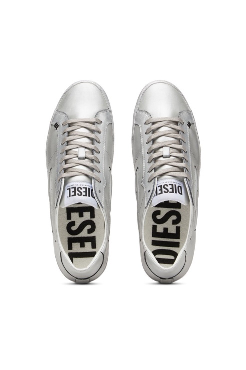 Paniers Pour Hommes En Cuir Souple Métallisé. Pré-vieillies Pour Un Effet Usé, Ces Chaussures Basses Ont Un Look Argenté Intégral Compensé Par La Semelle Extérieure Rouge. La Tige Est Poinçonnée Avec La Marque D Rembourrée Et Trois Points Distinctifs.