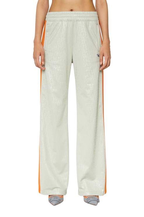 Pantalon De Survêtement Femme En Maille Chaîne Brillante, Orné D'un Imprimé Logo D Grad Dont La Taille Change Progressivement. Doublé De Gaze De Coton, Il Présente Une Jambe Droite Qui S'évase Vers La Cheville Et Des Bandes Latérales Encadrées De Passepoils. Écusson Logo Sur Le Devant.