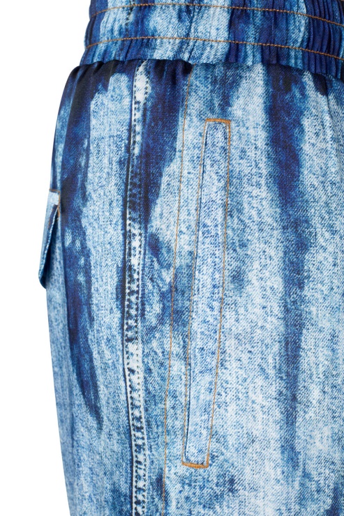 Ce Pantalon Unisexe Est Confectionné Dans Un Tissu Satiné Léger, Mettant En Valeur Un Imprimé Denim En Trompe-l'œil.