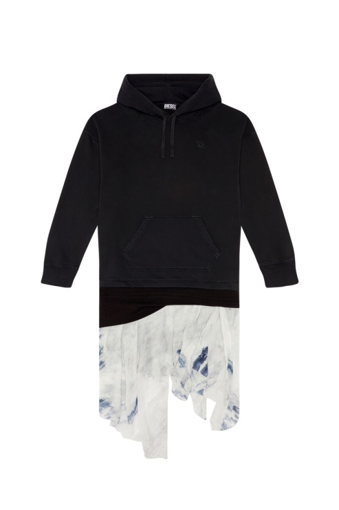Robe à Capuche En Jersey De Coton Bouclé, Avec Un Ourlet Fendu à Cordon De Serrage Bordé De Mousseline Asymétrique Avec Un Imprimé Denim Numérique. Son Profil Ample Est Rehaussé D'épaules Tombantes, Marqués D'un Logo D Ovale Brodé.