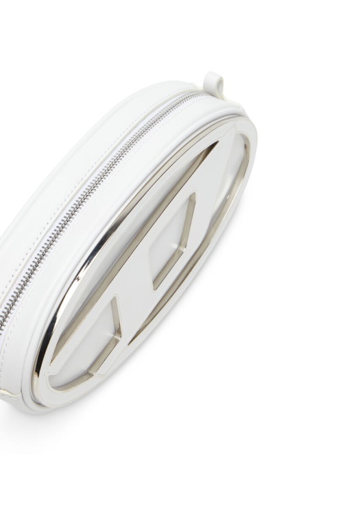 Sac à Bandoulière Pour Femme En Cuir Nappa Souple. En Forme De Pochette Carrée Ovale, Ce Sac Est Audacieusement Orné D'une Plaque D En Métal émaillé Et D'une Longue Tirette De Fermeture éclair Qui Sert également De Dragonne.