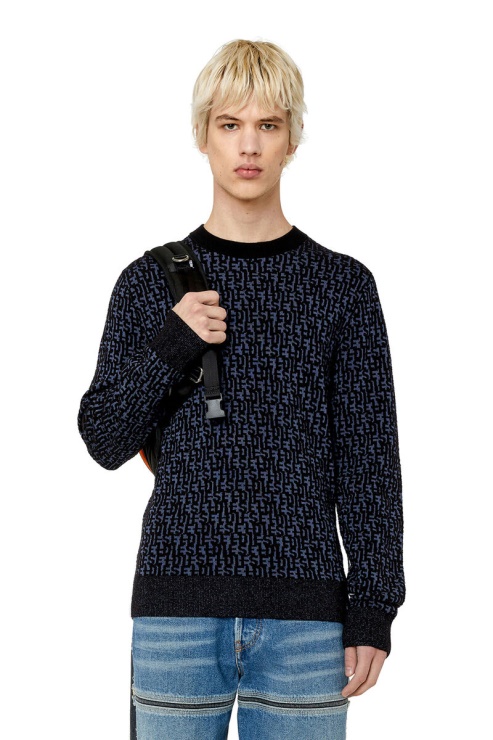 Ce Pull Tactile Pour Homme A Une Base En Viscose Bleue Et Un Monogramme Jacquard Diesel Tricoté Avec Du Fil Boucl Tactile. Un Passepoil Rouge Vif Trace Les Côtés Et Les Manches, Améliorant La Coupe épurée.