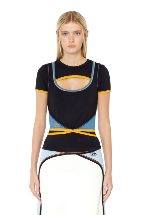 T-shirt Noir En Nylon Viscose Stretch à Mailles Milano, Affichant Une Silhouette à Double épaisseur Avec Découpe Sur La Poitrine Et Panneau Bleu à Nouer Dans Le Dos. Bordé D'une Bordure Contrastante, Ce Haut Pour Femme à La Coupe Ajustée Est Marqué D'un Logo D Brodé.