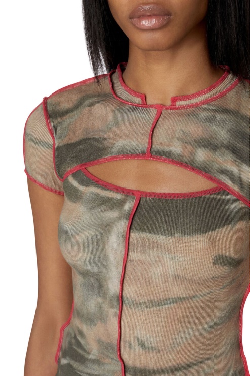 T-shirt Femme Coupe Slim En Coton Côtelé Léger Avec Imprimé Camouflage Numérique. Doté D'un Col Montant, D'une Découpe Sur La Poitrine Et D'une Fente Latérale, Il Est Bordé D'un Ourlet En Dentelle Contrastante Et De Surpiqûres Assorties. Marquée D'une Plaque D En Métal.
