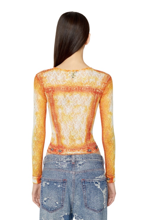 Issu De La Collection FW22 Runway Show, Ce Haut à Manches Longues Pour Femme Est Conçu Pour Une Coupe Ultra-slim En Dentelle Italienne. Mis à Jour Avec Un Imprimé Numérique En Trompe-l'œil Qui Imite Une Veste En Jean Traité Vintage.