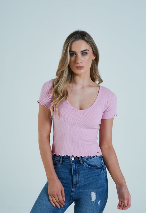 T-shirt Côtelé Super Doux à Col En V Court Avec Ourlets De Laitue. Fini Avec Un Badge En Métal Diesel. Le Mannequin Porte Du XS. Il Est Recommandé De S'en Tenir à Sa Taille Habituelle. 92 % Rayonne, 8 % élasthanne