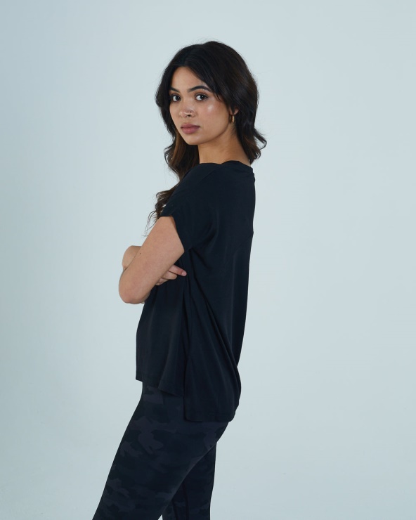T-shirt à Encolure En V Et Coupe Boxy Longue. Oeuvre De Poitrine En Caoutchouc De Silicone. Étiquette Drapeau Tissée Sur La Couture Latérale.