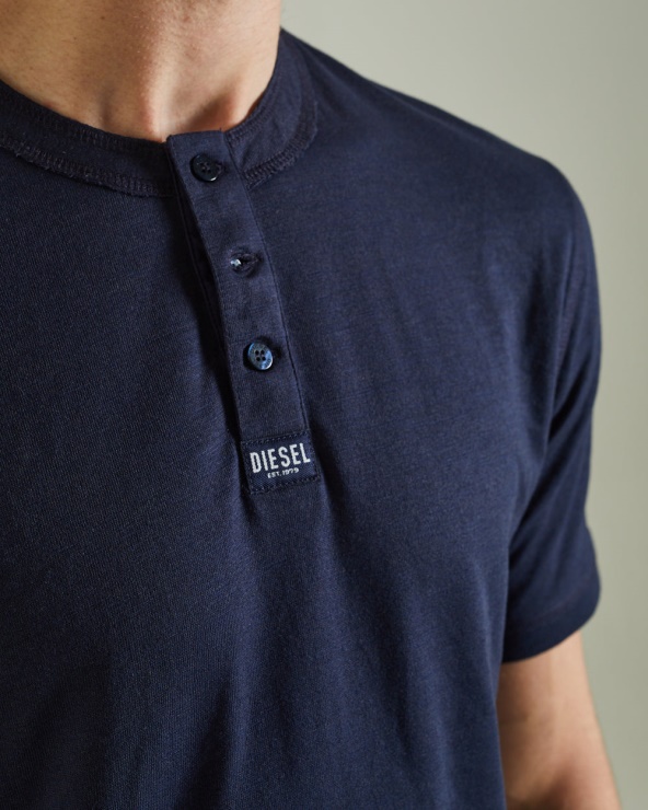 Haut à Manches Courtes De Style Henley Pour Homme Fabriqué à Partir D'un Jersey Chiné épais De Qualité Supérieure Pour Un Look Jeanswear Décontracté. Certaines Couleurs Ont été Doublées Afin Qu'elles Apparaissent Comme Une Couleur Unie. Garnitures Intérieures En Coton Tissé Avec Boutons De Marque Et étiquette Logo Diesel Au Bas Du Porte-boutons. Le Mannequin Porte Du M. Il Est Recommandé De Garder Votre Taille Habituelle. Corps : 50 % Coton, 50 % Polyester