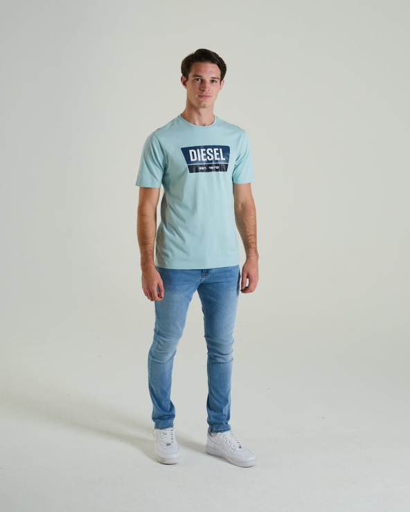 T-shirt En Jersey De Coton Pour Homme Avec Notre Illustration Classique Imprimée à L'encre Diesel Et Une étiquette Drapeau Tissée Près De L'ourlet.