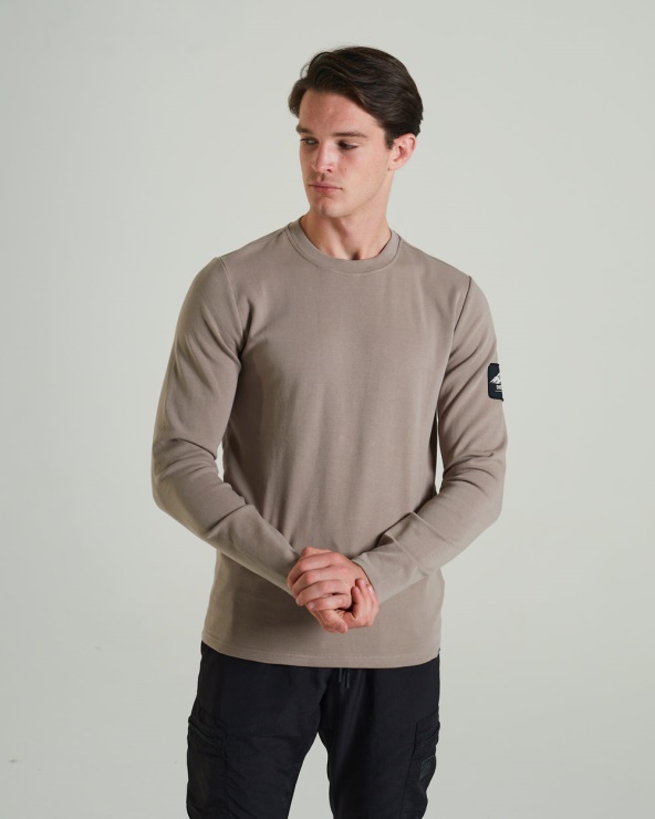 T-shirt à Manches Longues En Tissu De Coton Stretch Ultra-doux Et Confortable Avec écusson Tissé De La Marque Outdoor Sur La Manche. Barre En Métal De Marque Argentée à L'ouverture De La Poche. Le Mannequin Porte Du M. Il Est Recommandé De Garder Votre Taille Habituelle. 95% Coton 5% Élasthanne