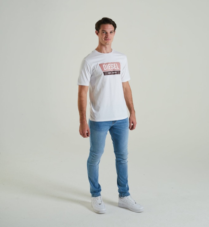 T-shirt En Jersey De Coton Pour Homme Avec Notre Illustration Classique Imprimée à L'encre Diesel Et Une étiquette Drapeau Tissée Près De L'ourlet.