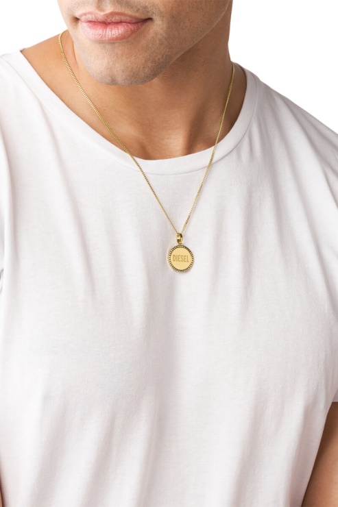Le Collier Pendentif De Diesel Est Composé D'acier Inoxydable Doré Et D'un Fermoir Mousqueton.