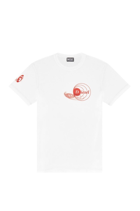 T-shirt Homme En Jersey De Coton Léger. Rehaussé De Fentes Latérales, Sa Coupe Ajustée Est Imprimée D'un Logo Diesel Circulaire Sur La Poitrine. Les Logos Transpercés Imprimés à L'intérieur De La Poitrine Et De La Manche Créent Un Effet Délavé.