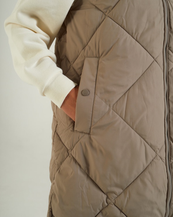 Gilet Matelassé Long Et Décontracté à Losanges. Petit Badge En Métal Sur La Poitrine Gauche Du Porteur