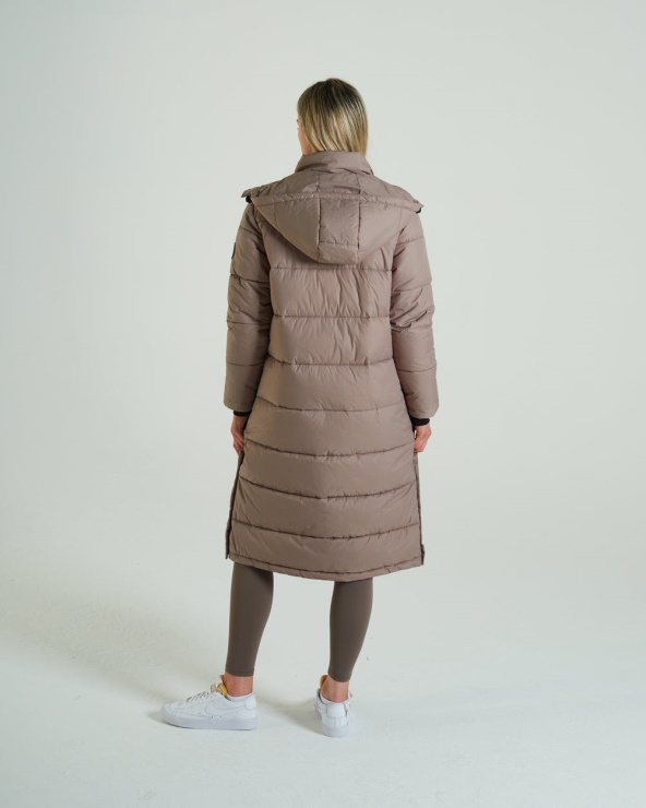 Manteau Matelassé Long Doublé Avec Boutons-pression Sur La Couture Latérale. Badge En Caoutchouc Sur Le Bras Gauche Du Porteur. Le Mannequin Porte Une Taille XS. Remplissage 100 % Polyester Recyclé.
