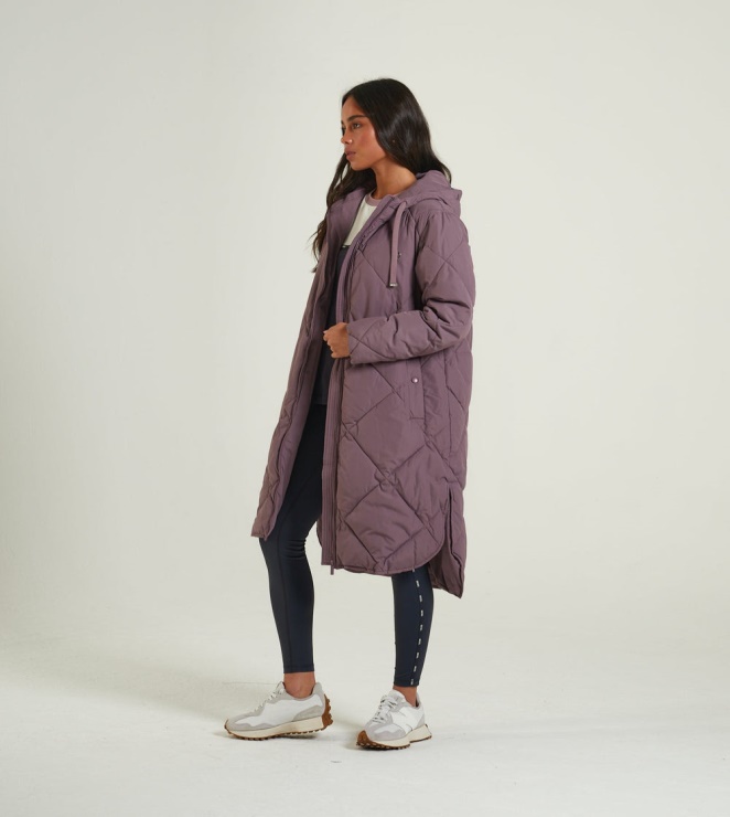 Manteau Matelassé Long Et Décontracté En Forme De Losanges. Petit Badge En Métal Sur La Poitrine Gauche Du Porteur
