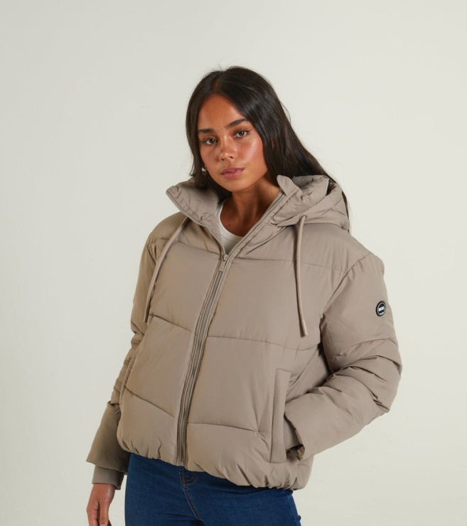 Doudoune Courte Avec Grand Matelassage à Chevrons Et Ourlet élastique. Écusson En Caoutchouc Sur Le Bras Gauche Du Porteur.