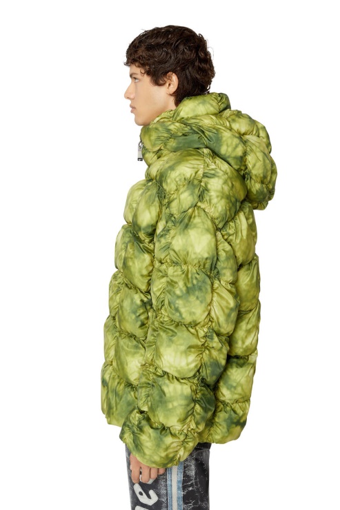 Veste D'hiver Pour Homme En Matelassé Ripstop Recyclé. Surimprimé Pour Simuler Un Mauvais Travail De Teinture, Le Tissu Est Froncé à L'aide D'une Technique De Smocks, Ce Qui Donne Un Motif Gonflé En Forme De Boîte. La Silhouette A Une Encolure Haute Capuche Et Une Coupe Classique.